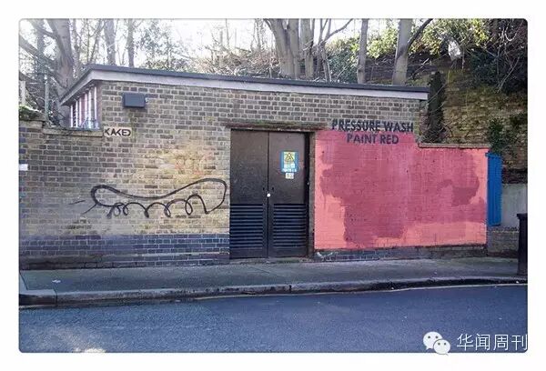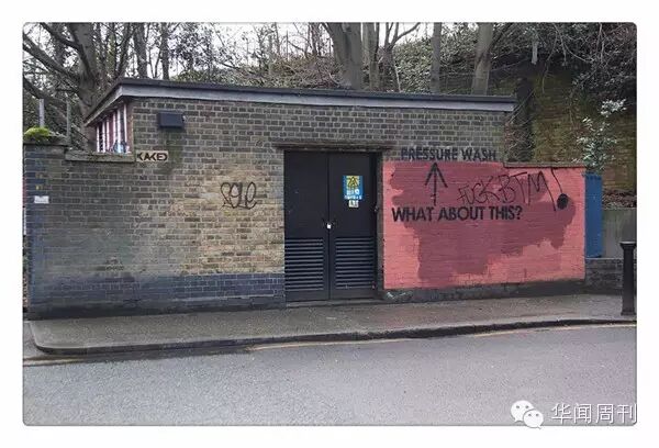 7. Mobstr忍不住开始向城管发牢骚,画上箭头,询问为啥红色区域外的没有比清洗?(WHAT ABOUT THIS?)最后,可能是“高压水枪部队”没空,他们直接用把红漆涂掉了黑色字体