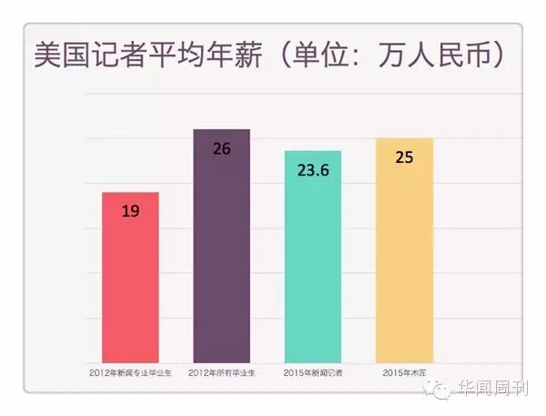 美国佐治亚大学对2012年美国新闻和大众传媒专业毕业生市场调查显示,新闻专业毕业生平均年薪为3.2万美元(约19万人民币)。据美国大学与就业协会统计,2012年美国所有毕业生的平均年薪为4.27万美元(约26万人民币),这一平均标准比新闻和大众传媒毕业生高出1万多美元(约6万人民币)。为贴补支出,近年来很多新闻和大众传媒专业毕业生都在寻求自由撰稿人等差事。