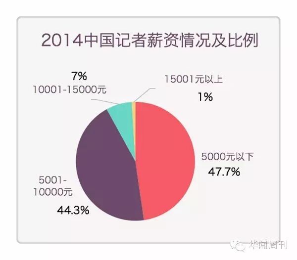 根据《2014中国新闻业年度观察报告》,中国新闻记者的平均年龄为32岁,男女比例基本持平,平均年薪为8.4万人民币,九成以上的记者月收入低于10000元,其中47.7%的人月收入在5000元以下,44.3%的人月收入在5001-10000元之间,只有7%的人月收入在10001-15000元之间,而月收入15001元以上的记者只有1%。