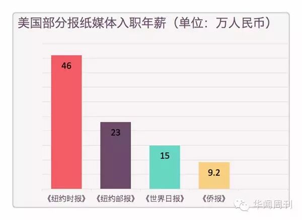 在有“西方报业老大”之誉的《纽约时报》做记者,入职年薪是7.5万美金(约46万人民币),待遇之优厚居全美各报之首,比默多克在美国的旗舰报纸《纽约邮报》(NewYork Post)的记者收入高一倍,是美国收入最高的中文报纸《世界日报》的3倍,更是《侨报》等大部分中文报纸的5倍。