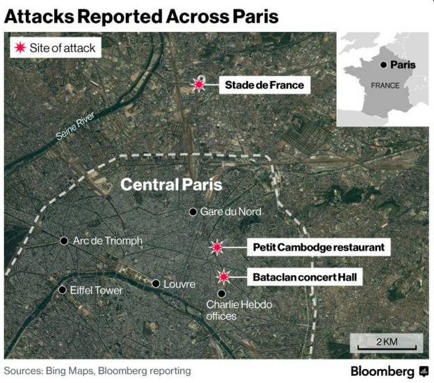 周五的晚上,一连串的枪击和爆炸震惊了巴黎。根据法新社的消息,截止目前,在巴黎市区和大巴黎地区的圣丹尼,共有七处地点遭到袭击,至少39人死亡,五十多人受伤。这些袭击似乎是串通好的,大约从晚间10点30分,几乎在同时被引爆,瞄准了巴黎11区的一间亚洲餐厅“小柬埔寨餐厅”(Le Petit Cambodge)和它对面的时钟酒吧(Le Carillon), 以及不远处的一间咖啡厅。