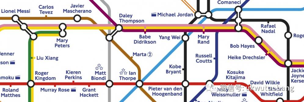 话说2012年伦敦奥运会时,推出了轰动一时的“伦敦传奇地铁图”(Olympic Legends Map),把伦敦地铁站名改成了运动員名字。