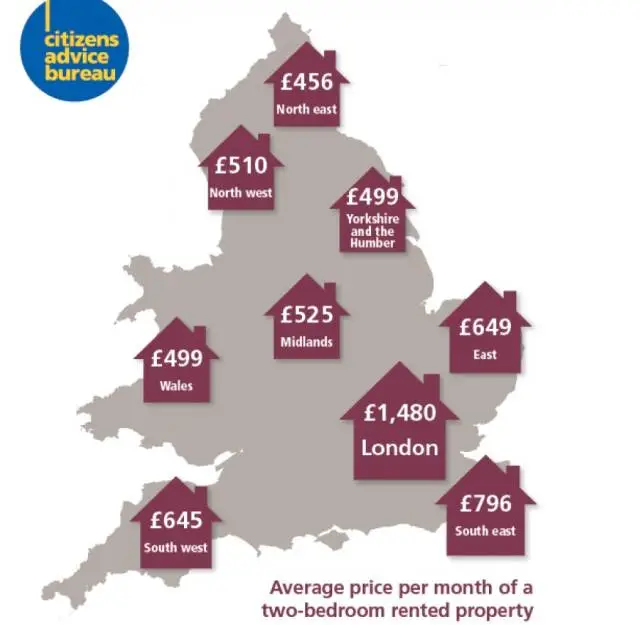 这是英国各个城市两室一厅的平均每月房租费,伦敦的房租也是硬生生地翻倍了。大多数伦敦工薪阶层的一大部分工资都直接贡献给房东了。