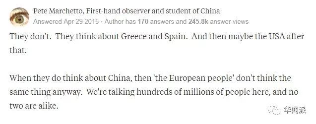 “欧洲国家其实并不关心中国是怎样的。他们关心得更多是希腊和西班牙怎样,其次是关注美国。那些真能想到中国的人,也不会有同样的观点。因为每个人的观点都不一样。”