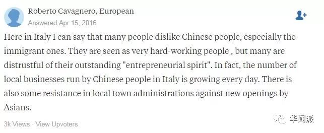 意大利人则回答,“在意大利,我可以说很多人不喜欢中国人,特别是移民。他们被视为非常勤奋的人,但他们杰出的“企业家精神”却不是那么让人信任。有些当地政府会对亚洲人开办的企业有抵触。”