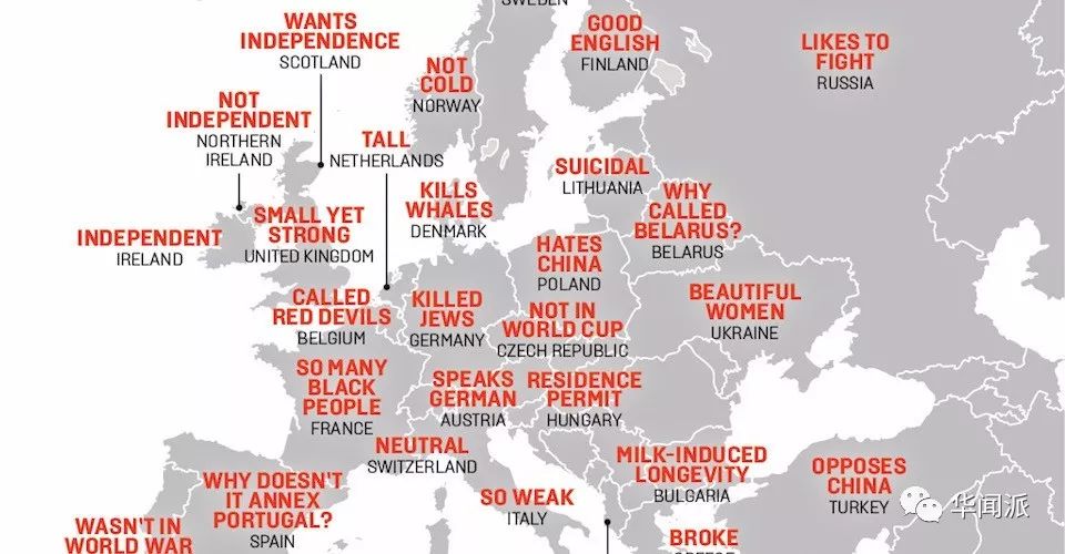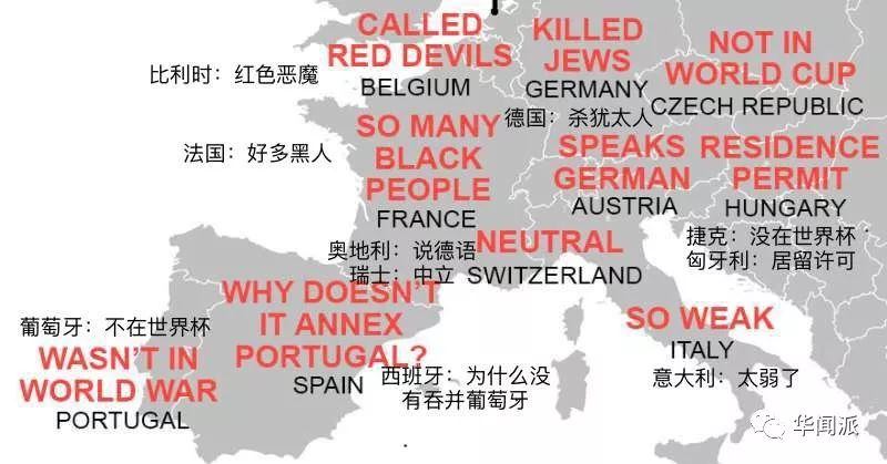 而向来以浪漫著称的法国,被贴上“好多黑人”的标签,意大利被形容为“弱爆了”,德国被归纳为“杀犹太人”,西班牙被质疑“为什么不吞并葡萄牙”……