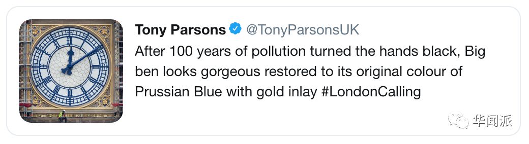 不过,关于大本钟钟面为什么要刷成蓝色,却存在一点争议。记者Tony Parsons发推表示,“大本钟的初始钟面就是皇家蓝,变黑是因为100多年来伦敦的雾霾和空气污染……”