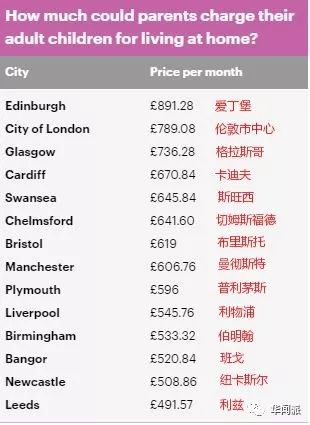 令人吃惊的是,根据这个标准,伦敦的平均收费竟然不是最高的。在考虑到食物和水电煤气等开销后,居住在爱丁堡的父母可以向子女收取每月890英镑的费用。这比伦敦地区还要多100英镑。