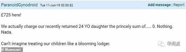 网友ParanoidGynodroid:我这里是725英镑!事实上,我们向我们24岁刚回来的女儿收取了一笔……0英镑的巨款。免费。我无法想象把我们的孩子当成一个精力充沛的房客。