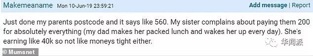 网友Makemeaname:刚刚输入了我父母家的邮编,上面写着560英镑。我姐姐整天抱怨要付200英镑给爸妈。(我爸爸还给她准备午饭,并且每天负责叫醒她)。她挣4万英镑,用钱方面根本就不紧张。