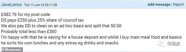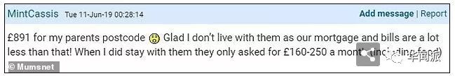 网友MintCassis:我父母的邮编(指出我要付)891英镑。好险,我已经不再跟他们一起住了,我的房贷和煤气水电费都比这个要少。当初,我跟他们住的时候,他们只收了我160-200英镑,还包吃。