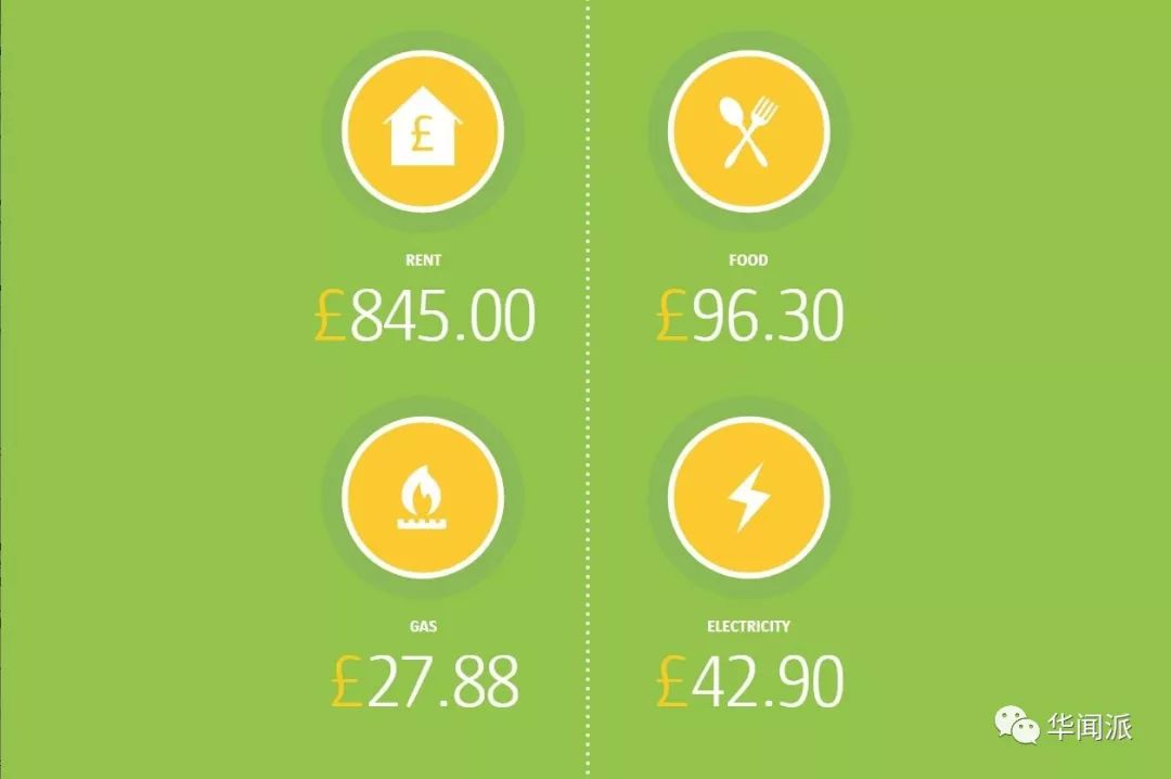 其中房租为845英镑、食物为96.3英镑、煤气费是27.88英镑、电费为42.9英镑。