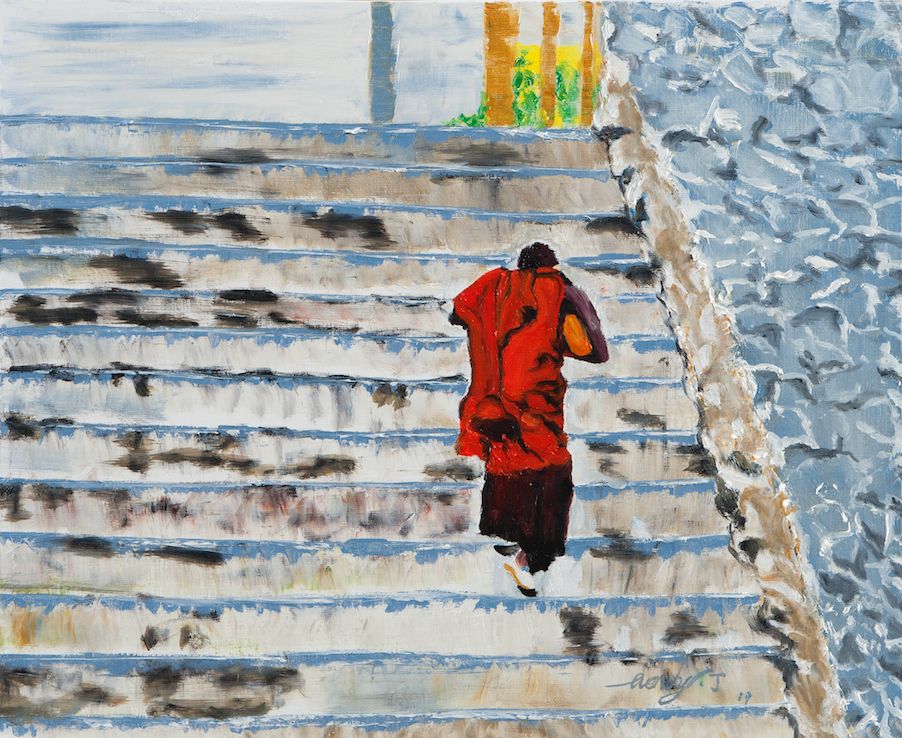 石阶上的僧人,布面油画,2019, 500 x 600mm