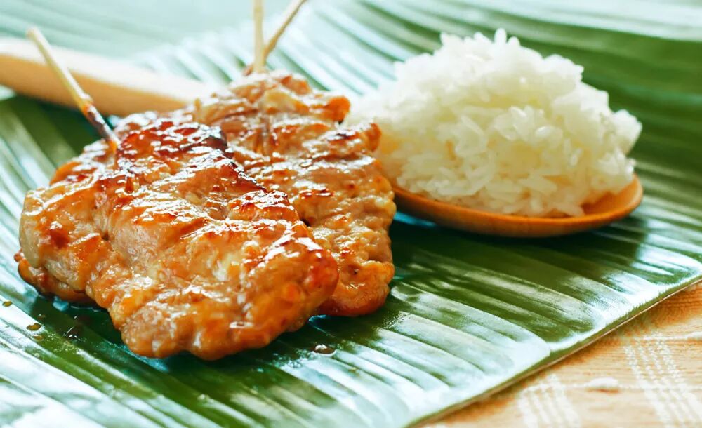 烤猪肉/鸡肉串配上糯米饭(ข้าวเหนี่ยวหมูปิ้ง),也是泰国常见的街头早餐摊贩。