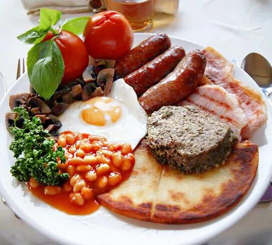 Full Scottish breakfast除了番茄、吐司、培根、英式香肠、黑布丁外,还有苏格兰的特产Haggis。