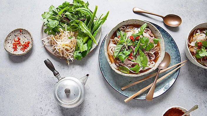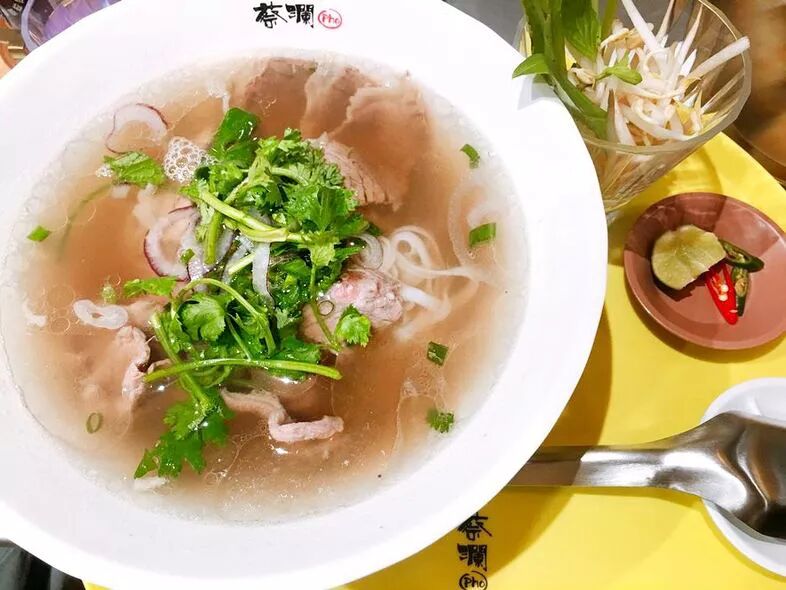 越南Pho的基本配备,都是以鸡汤为底,搭配米线、牛肉、香菜等,放在大碗里。