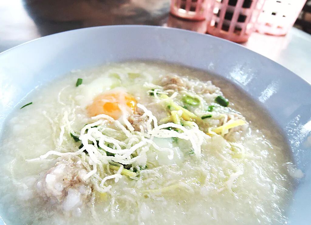 早餐粥在泰国分成两种:一是米煮得很烂的猪肉粥,用泰国有名的茉莉香米和猪肉、内脏一起熬煮,最后撒上生姜丝和香菜,散发出独特的香气。