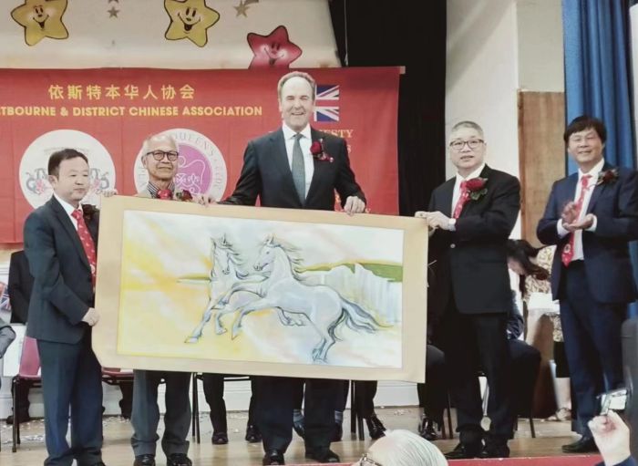 为表达对英国女王铂金禧年的喜庆之情,伊斯特本华人协会在仪式上代请布莱克曼上议院议员向英女王转赠了一幅中国画作品《白马图》。
